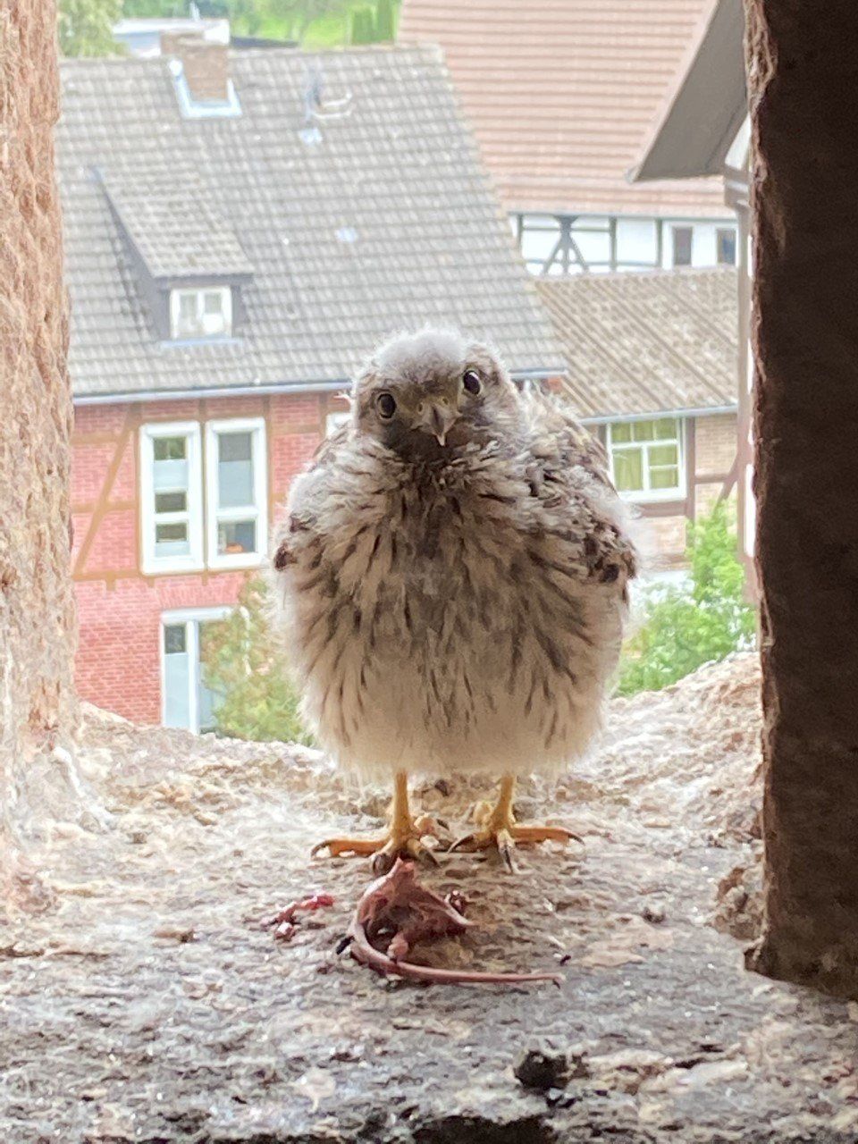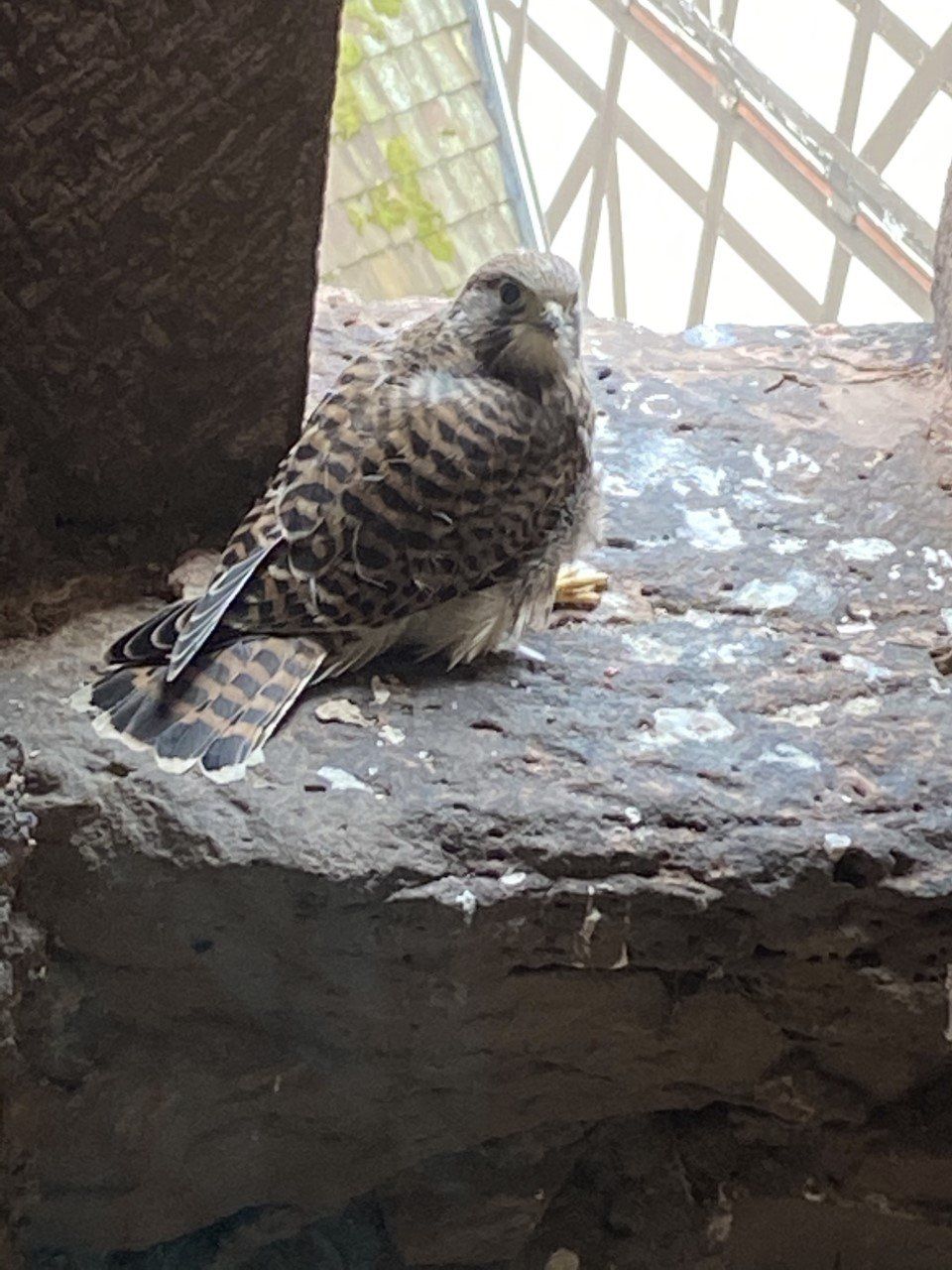 2020 war unser Kirchturm die Kinderstube für 11 junge Turmfalken. Das ist schon außergewöhnlich. Wie gut, dass unser Turm zu jeder Himmelrichtung gut geeignete Fensternischen in luftiger Höhe einladend bereithält – da kommt man sich halt nicht in die Quere.